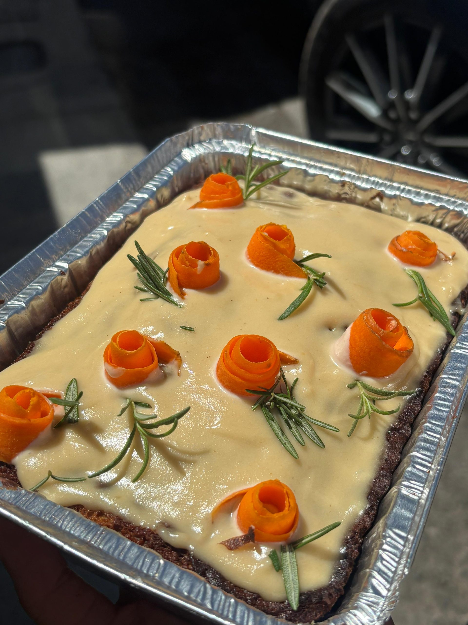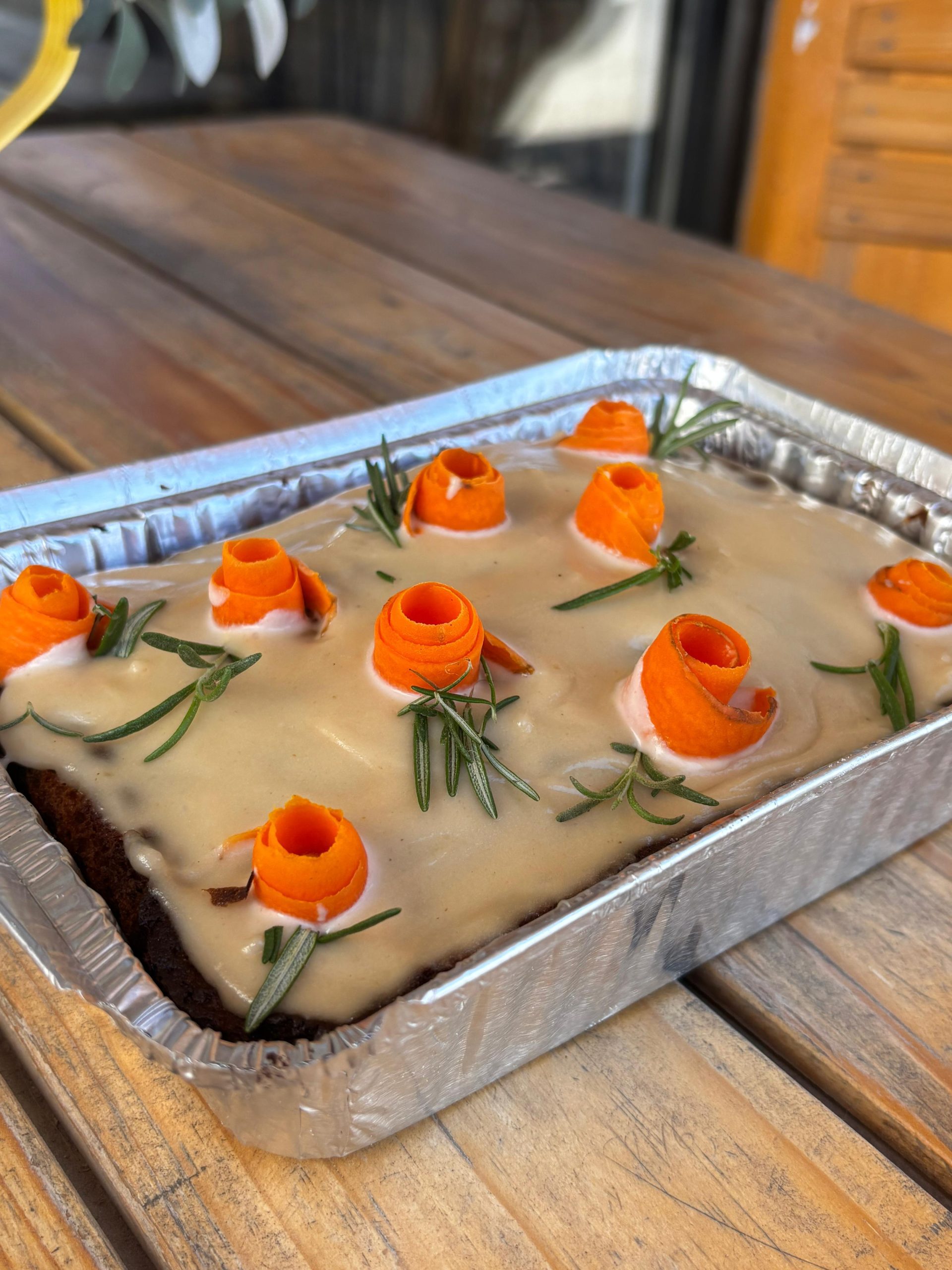 Panqué de zanahoria especiado con betun cremoso de nuez de la india.