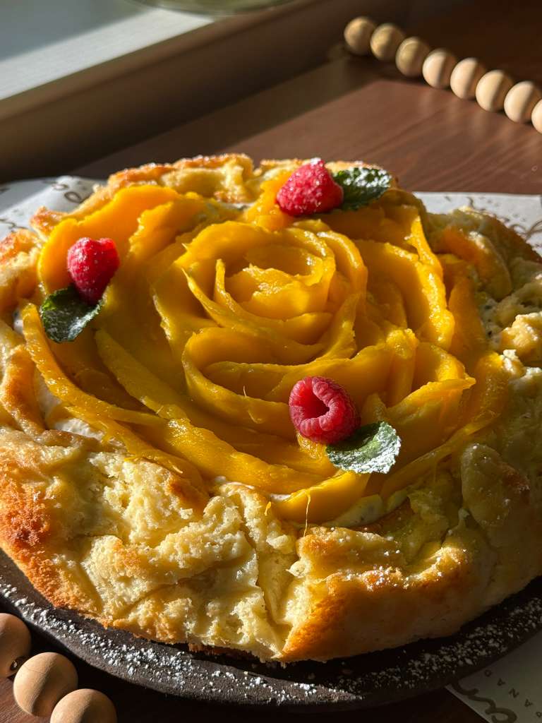 Tarta de queso horneada al estilo vasco, de interior suave y cremoso, coronada con crema de cardamomo y mango natural.