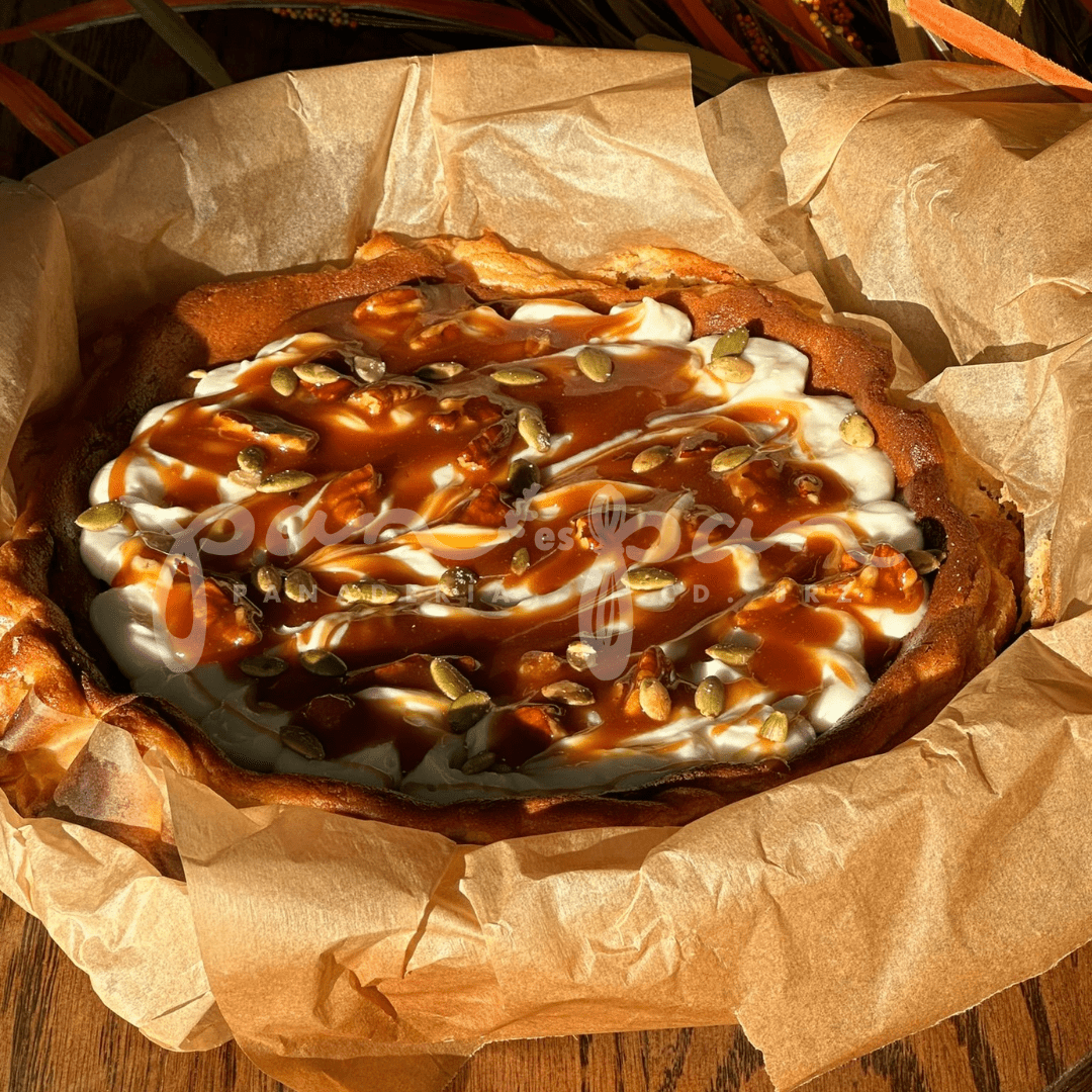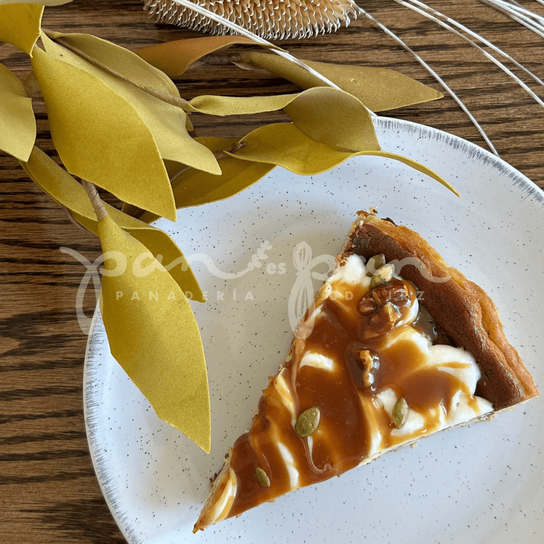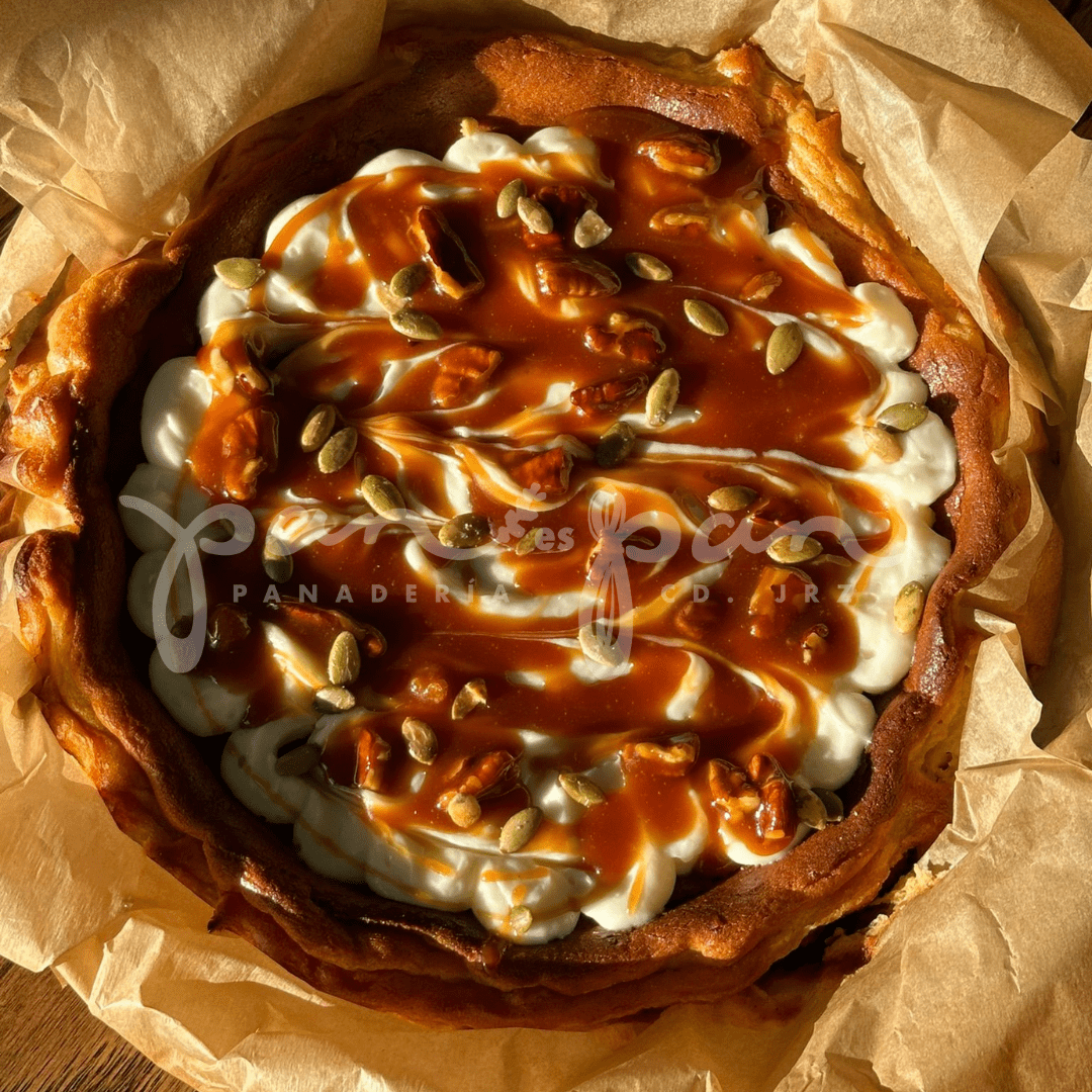 Tarta de queso horneada al estilo vasco con auténtica calabaza natural y un toque de especias otoñales decorado con crema chantilly, caramelo y pepitas.
